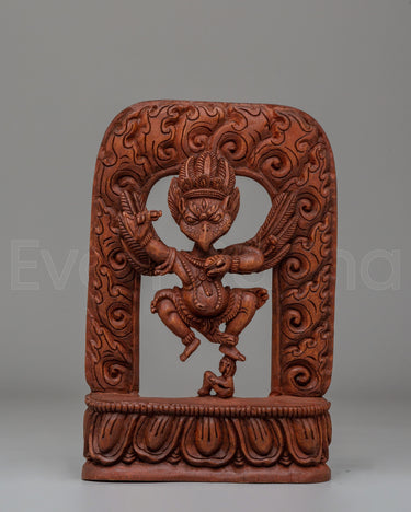 In Buddhist art, Garuda is often depicted in conflict with the Nagas, whom he is seen as opposing. The battle between the Nagas and Garuda symbolizes the conflict between opposing forces in life, such as harmony and discord. Garuda's victory over the Nagas signifies the triumph of spiritual virtues over vices.