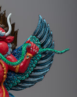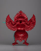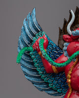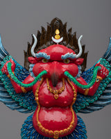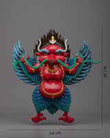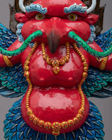 Introducing the magnificent Big Garuda Statue, skillfully handcrafted on a sturdy copper body. Standing tall with its wings unfurled, this awe-inspiring statue showcases intricate acrylic painting, bringing life and vibrancy to its divine form. With every detail meticulously rendered, this Garuda Statue embodies strength, courage, and protection, symbolizing triumph over negativity and obstacles. A true centerpiece for any sacred space, this artful creation is sure to inspire awe and reverence in the hearts of all who behold it.