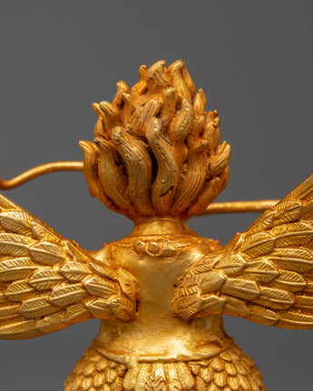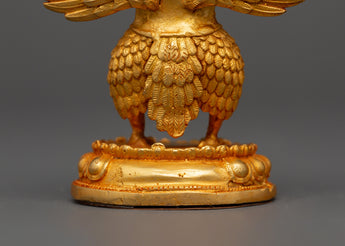 This Garuda statue is crafted from copper and finished with a gold plating. The figurine, which measures 8.5 cm in height and 8 cm in breadth and weighs 0.15 kg, depicts Garuda in his magnificent, winged form, representing speed, power, and divine protection. In Buddhist and Hindu beliefs, Garuda is revered as the perpetual foe of nagas (serpent spirits) and as Lord Vishnu's mount or vehicle.