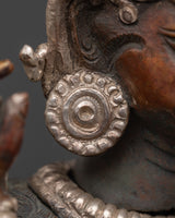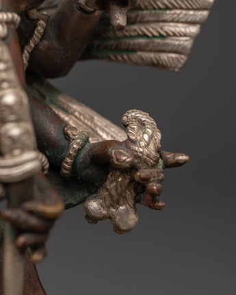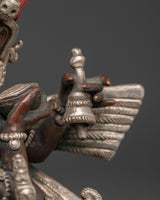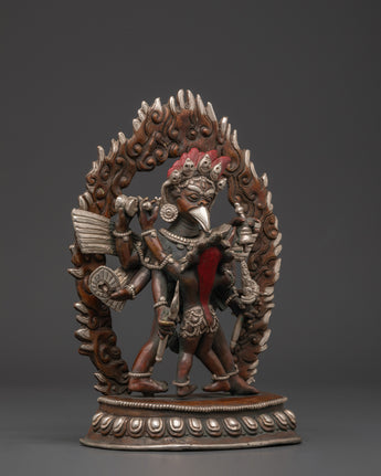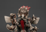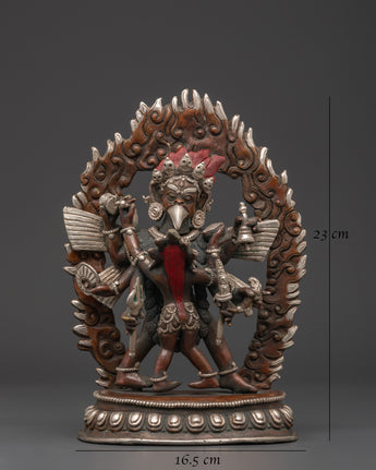 This magnificent Garuda with Consort Figurine is a stunning work of spiritual art, meticulously created from oxidized copper and silver plating. Standing 23cm tall, it depicts the mythological grandeur of Garuda, the heavenly bird deity in Hindu mythology, noted for his everlasting loyalty and strength. This exquisite sculpture is designed to evoke a sense of power and protection in your sacred space, making it an ideal addition to any altar, meditation room, or home decor collection.