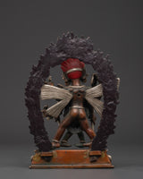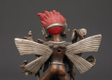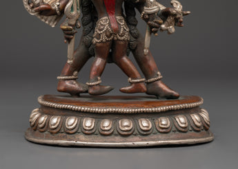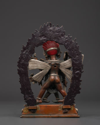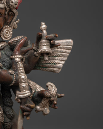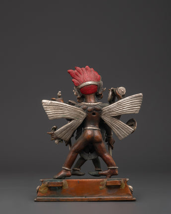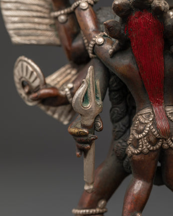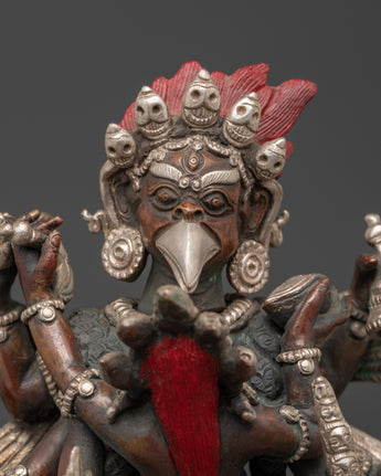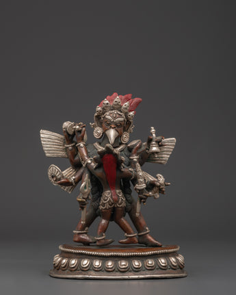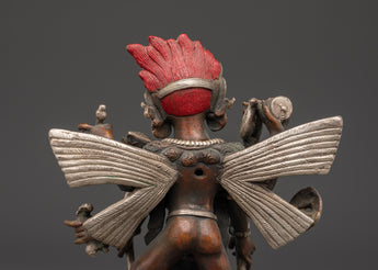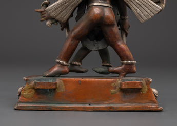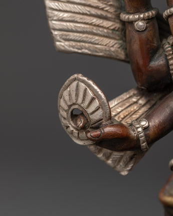 This statue, crafted from materials such as oxidized copper and featuring silver-plated accents, showcases intricate detailing that symbolizes the deep spiritual significance of Garuda and his consort. The sculpture's brilliant, rich tones enhance its visual appeal, representing Garuda's strength and wisdom. This statue is not only a unique and culturally significant decorative sculpture, but it also serves as a strong reminder of spiritual liberation and triumph over adversity. This Garuda statue represents mythological prowess, adding aesthetic and spiritual significance to your area.