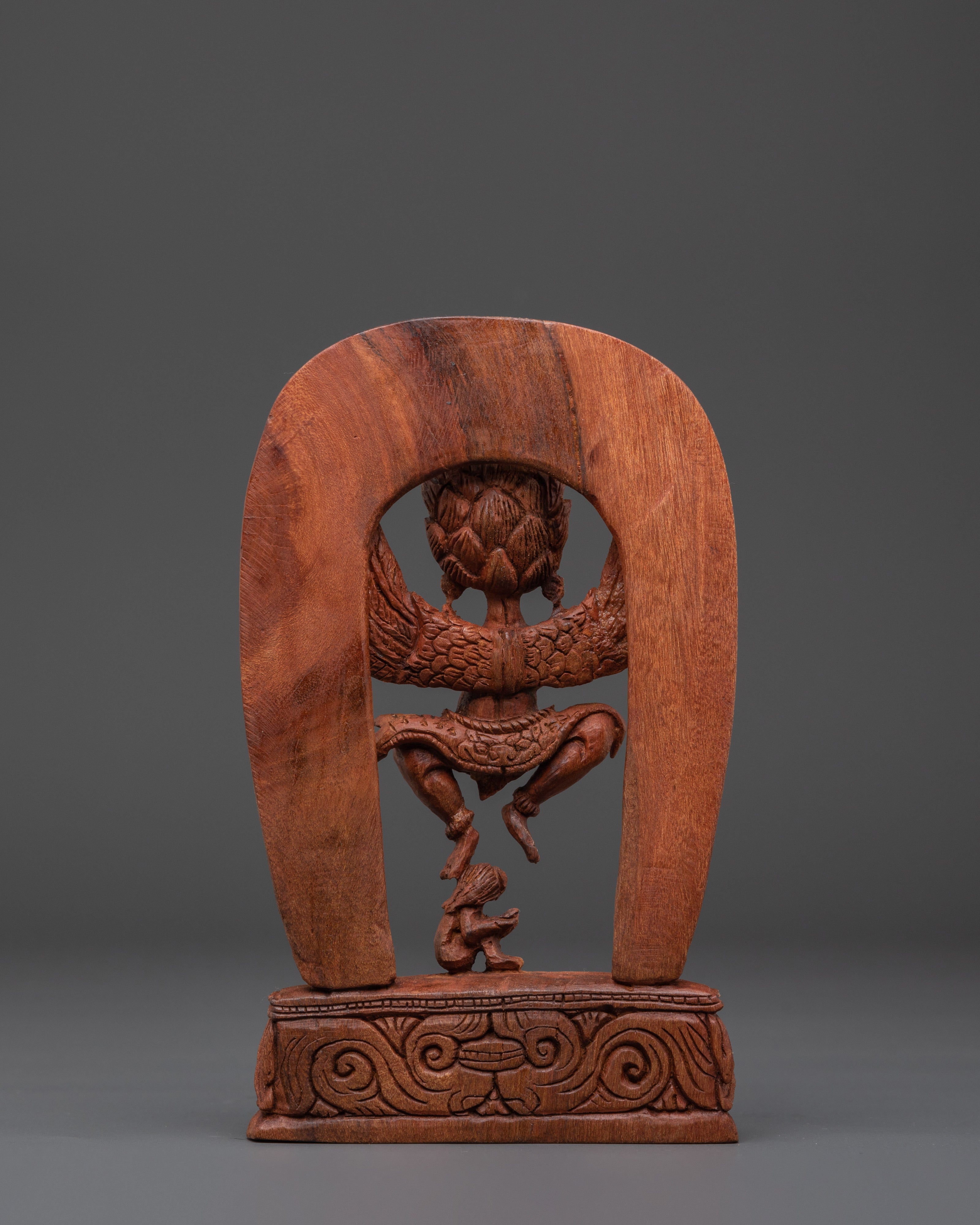 The strong mythological bird Garuda, who is regarded as a guardian against evil forces in Hindu and Buddhist religions, is shown in striking detail in this Majestic Protector Garuda Statue. This statue, which is 20.5 cm tall and 12.5 cm wide and is made of wood, is an important addition to any collection. With its wings spread wide, the Garuda is portrayed in a majestic position that represents bravery, strength, and the capacity to repel evil forces. Garuda is brought to life by the dynamic design and fine details, which emphasize its divine qualities of watchfulness and protection.