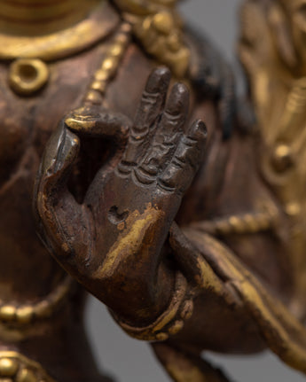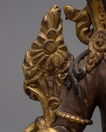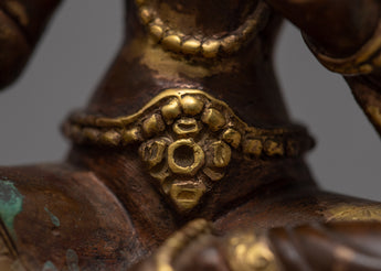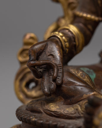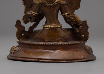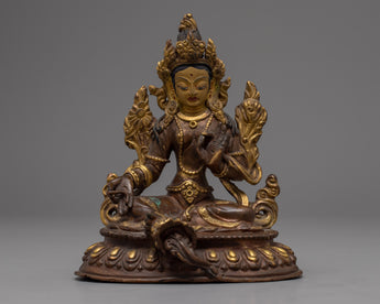 The Green Tara, often known as the Buddhist Mother Deity, is portrayed in this sculpture. Her entire face is covered with gold, and she emits complete calm. Her beautifully shaped eyes cast a faraway glance. She has exquisite Himalayan Art carvings and themes and is completely wrapped in gold.