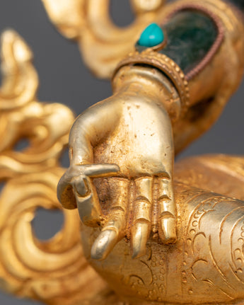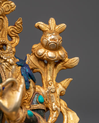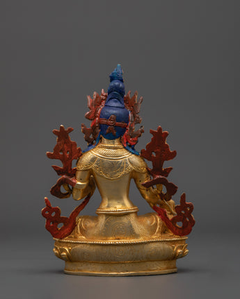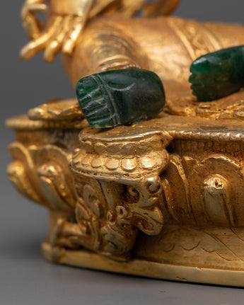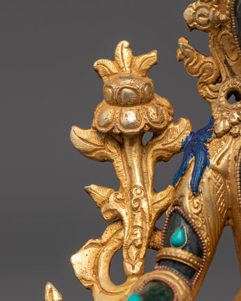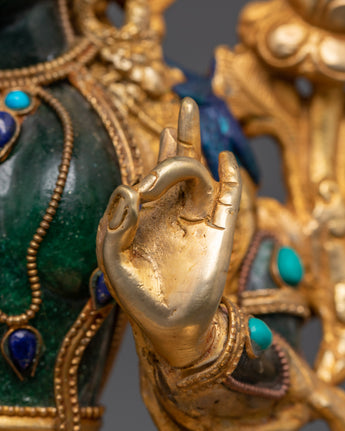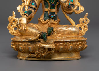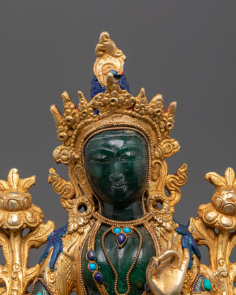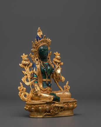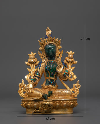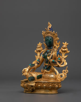 This beautifully crafted Compassionate Deity Shyama Tara Statue represents compassion and healing in Tibetan Buddhist practice. This statue, crafted from copper and plated in gold, has a gorgeous malachite stone face that exudes serenity and protection. Tara's holy essence is brought to life by the rich workmanship, which includes delicate floral motifs and spiritual symbolism. This statue is a compelling centerpiece for any sacred place. The goddess is depicted in a peaceful seated stance, representing serenity and compassion, with a golden crown and radiant jewels reflecting her spiritual grace.
