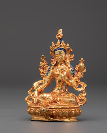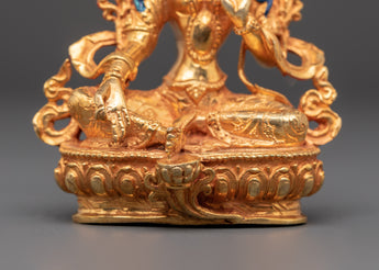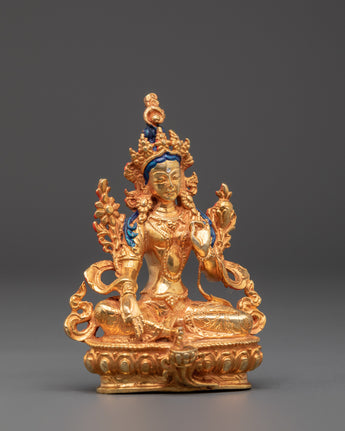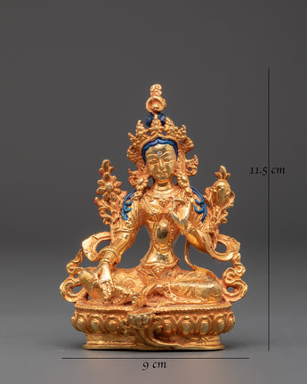 The Compassionate Deity Shyama Tara Statue is one of the most cherished representations in Tibetan Buddhism, symbolizing compassion in action and protection from obstacles. This sacred sculpture measures 11.5cm in height and 9cm in width, with a weight of 0.34kg, and is meticulously crafted from copper with gold plating. Green Tara, often invoked as the “Swift Savior,” is revered for her immediate response to the prayers of devotees, offering blessings of safety, guidance, and spiritual clarity.