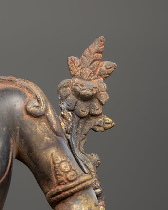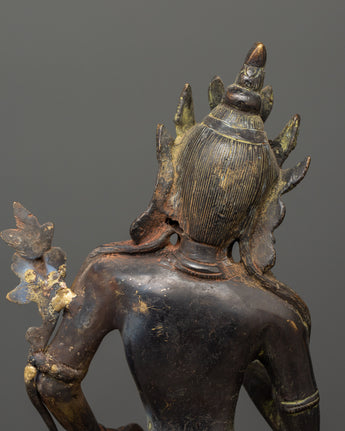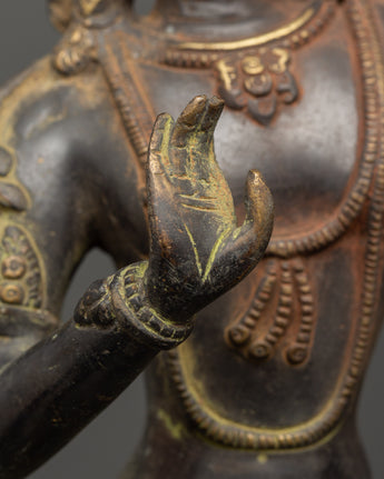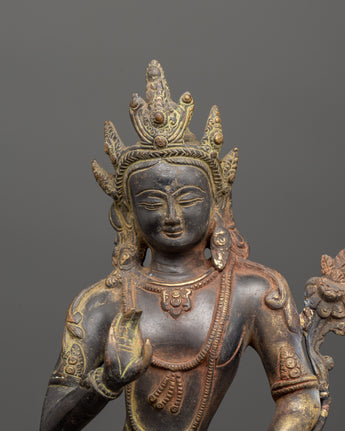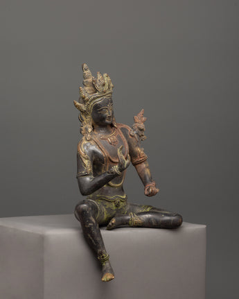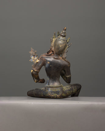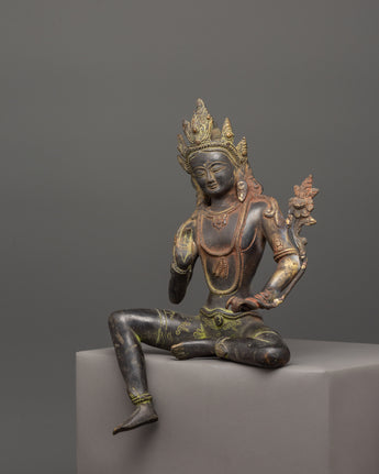 The goddess is adorned with a five-jewel crown, highlighting her divine royalty and wisdom. Her detailed attire and intricate jewelry reflect her divine presence's richness, embodying beauty and grace. The antique finish adds a timeless quality to the sculpture, ensuring that it resonates with profound spiritual energy. Green Tara is often seen as the embodiment of compassion and swift action, and this statue captures both aspects, inviting her blessing and protection into any space. The meticulous design, with fine details such as the lotus and the crown, makes it an excellent addition to spiritual collections or altars, where it can serve as a symbol of strength, compassion, and peace.