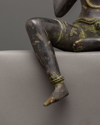 This Green Tara Goddess statue is a stunning representation of compassion and protection. Standing at 33.5 cm in height and 19 cm in width, the statue weighs 3.12 kg and is meticulously crafted from brass with an antique finish. The right hand of the goddess is held in Abhaya Mudra, the gesture of protection, symbolizing her role as a protector from fear. This mudra reassures the devotee of her divine intervention, offering peace and safety. Her left-hand holds a lotus flower stem, signifying purity, spiritual growth, and the blossoming of enlightenment. Her posture, with the right leg extended outward, further emphasizes her readiness to assist and her dynamic nature, gracefully seated in a posture of contemplation and readiness for action.