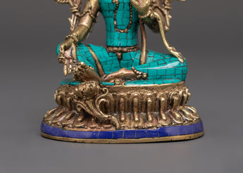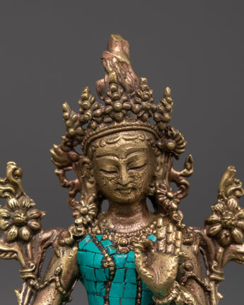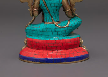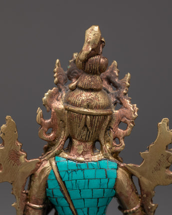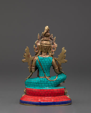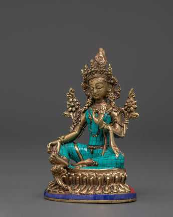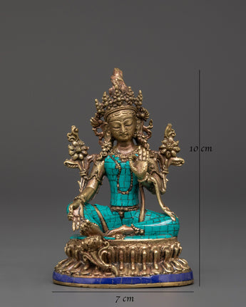 This exquisitely carved Green Tara Brass Statue will add a sense of peace and divine elegance to your hallowed area. This finely detailed figure, which is 10 cm tall and 7 cm wide, is crafted from premium brass and embellished with imitation turquoise and lapis lazuli stones. Green Tara, the Tibetan Goddess of Compassion and Protection, is shown in a graceful pose symbolizing swift help and care for all beings. This brass statue brings healing energy and spiritual calm to your space.This statue is a wonderful addition to your altar, meditation space, or collection of spiritual décor because it exudes positive energy.