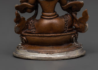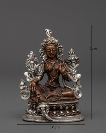 This Green Tara statue is a spiritual representation of swift compassion and divine feminine energy. It is made of oxidized copper and gently highlighted with silver plating. It is only 6cm tall, 4.5cm wide, and weighs 0.068kg. Despite being tiny, this figurine has a strong spiritual presence and is a valuable addition to any altar, meditation place, or personal shrine.