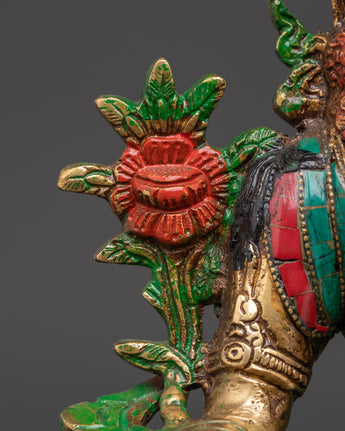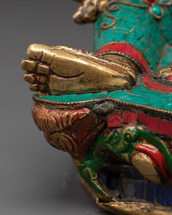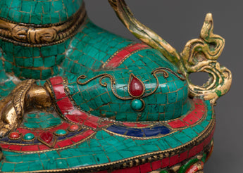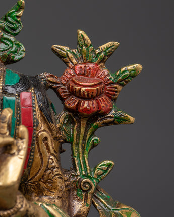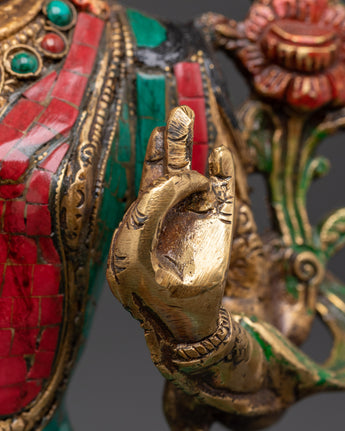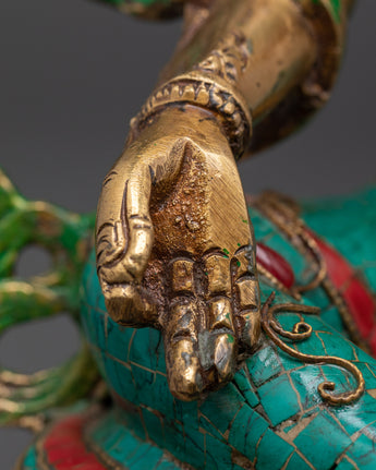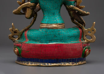 This stunning Bodhisattva Green Tara Compassionate Protector Statue is skillfully crafted from brass and adorned with brilliant artificial coral and turquoise stones, enhancing its religious and artistic significance. Standing 32.5 cm tall and 23 cm broad, this statue draws attention in any meditation area or altar. The meticulous details of the lotus seat, jewels, and hand gestures demonstrates superb craftsmanship, transforming it into both a spiritual figure and a stunning ornamental object.