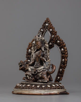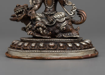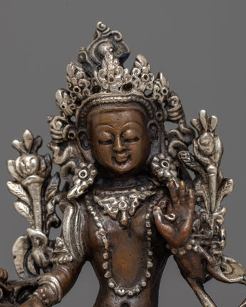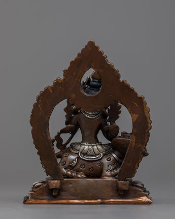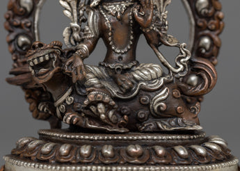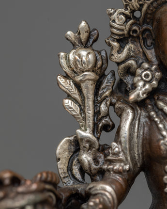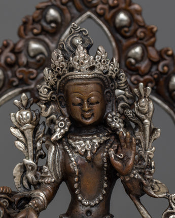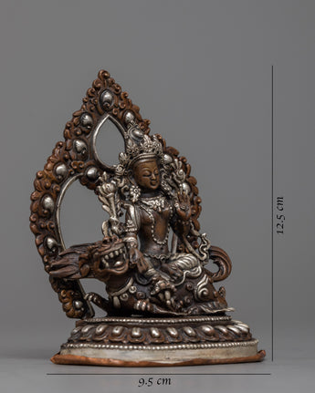 With this beautiful statue of Green Tara Devi, decorated with silver plating and painstakingly machine-made on an oxidized copper body, you can embrace her caring presence. This statue, which measures 12.5 cm in height and 9.5 cm in breadth, exudes spiritual beauty and elegance. It offers a large and significant touch to any religious area, weighing only 0.54 kg.