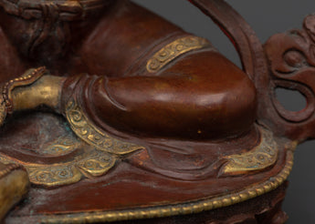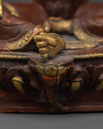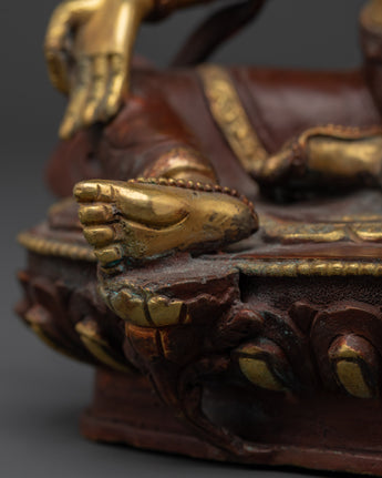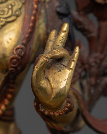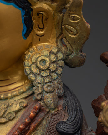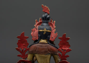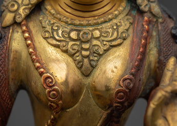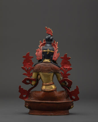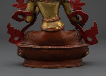 With this Green Tara Female Bodhisattva Statue, a sacred portrayal of one of Tibetan Buddhism's most cherished deities, you may add the presence of swift compassion and heavenly protection to your home. Handcrafted from oxidized copper and accented with bright gold plating, this imposing sculpture stands 22.5cm tall and 16cm broad, weighing a solid 1.45kg. Green Tara is known as the Mother of Liberation, and she sits in a stance of readiness to help all creatures overcome fear, suffering, and difficulties. Her open right palm and the growing lotus blossoms represent active compassion and spiritual awakening.