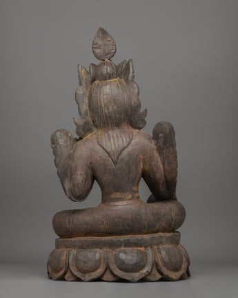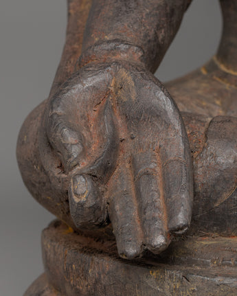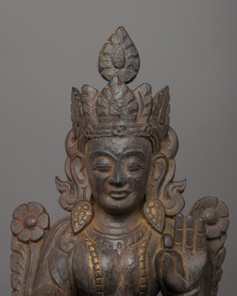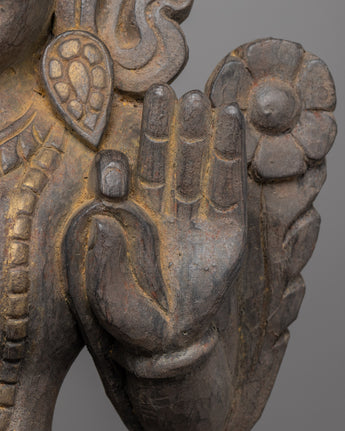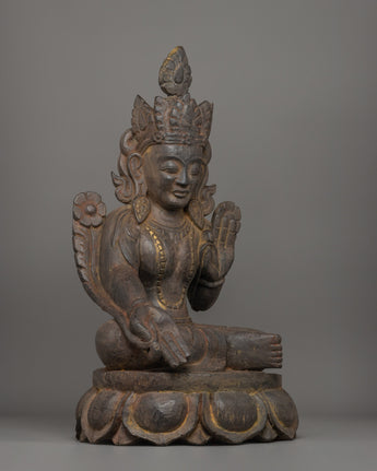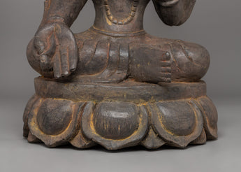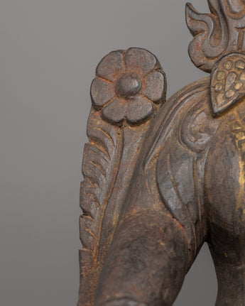 The Green Tara for Altar is crafted from wood, stands 58.5 cm tall, and radiates tranquility and spiritual presence. Adorned with a five-jeweled crown, symbolizing her enlightened nature, this statue beautifully captures Tara’s compassionate and serene expression. Seated gracefully on a lotus base, she embodies purity and compassionate action, as the lotus represents spiritual awakening and divine presence. The intricate carvings on the figure add a sense of movement and life, enhancing its sacred aura.