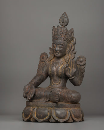 The Green Tara figure is adorned with exquisite jewelry, reflecting her divine beauty. She wears earrings and a bracelet that symbolizes her royal stature. A middle-length necklace drapes elegantly across her chest, symbolizing her spiritual richness and grace. These fine details and masterful craftsmanship make this sculpture a perfect addition to any altar or sacred space, enhancing its spiritual ambiance and significance.