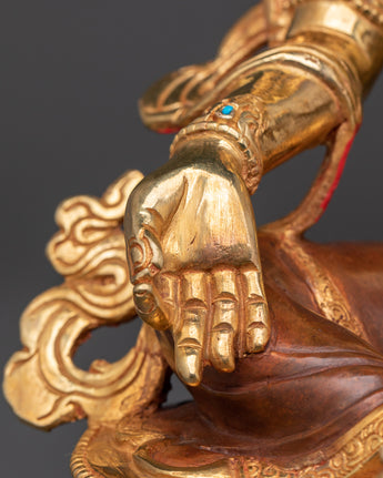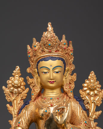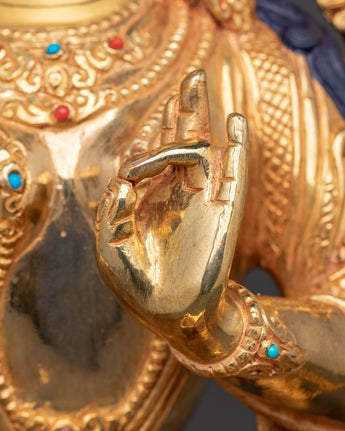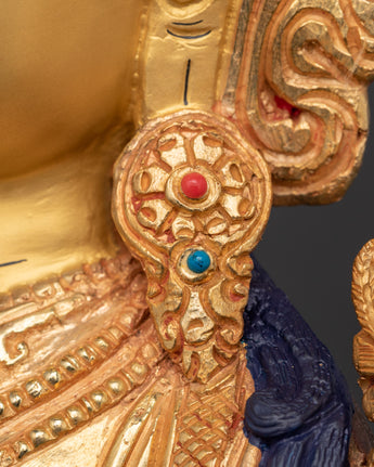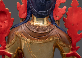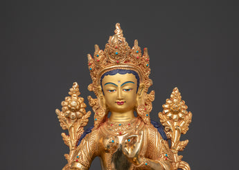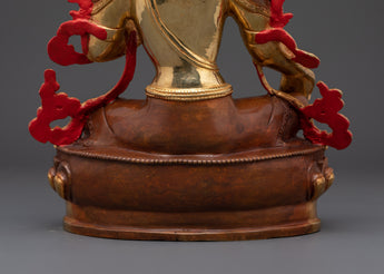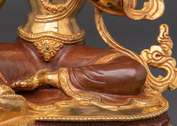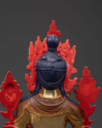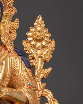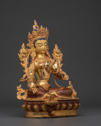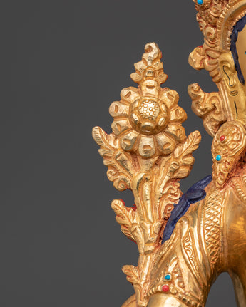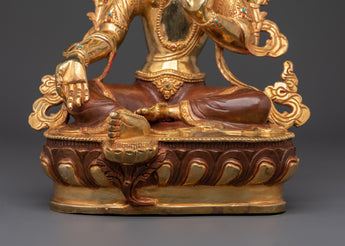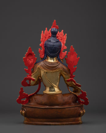 The Green Tara statue is more than simply a decorative piece; it is a potent symbol of healing and protection. The oxidized copper construction gives it a rich, vintage appearance, while the gold-plated embellishments provide a touch of heavenly beauty. With a weight of 3.74 kg, this large sculpture serves as a spiritual anchor, guiding you through meditation and toward inner calm. This Green Tara statue, whether displayed as a centerpiece or near your altar, helps guide you on your spiritual journey and enhances the energy in your sacred space.