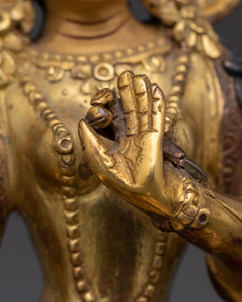 Bring calm and serenity into your home with this Green Tara Statue for Peace, which is masterfully handcrafted from copper and finished with a bright gold plating. Standing 14 cm tall and weighing only 0.23 kg, this statue represents the loving and healing energy of Green Tara, a revered Tibetan Buddhist deity. Green Tara, renowned for her ability to bring peace, healing, and protection, embodies unconditional love, tranquility, and serenity. This monument serves as a constant reminder to live with compassion and grace, resulting in a peaceful environment wherever it is placed.