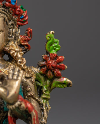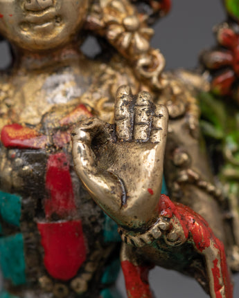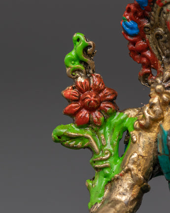 Measuring 10 cm in height, this exquisite statue features vibrant artificial stones carefully arranged to amplify its spiritual presence. The brass base, adorned with hand-painted details, showcases traditional Himalayan craftsmanship, elevating it beyond a spiritual artifact to a collectible work of art. Perfect for personal altars, meditation spaces, or as a thoughtful spiritual gift, this piece embodies protection and the power of the divine feminine.