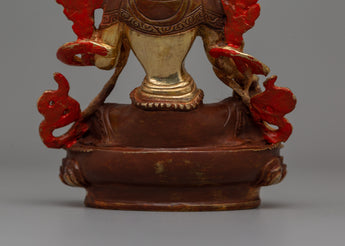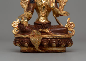This spiritual monument, meticulously made by experienced artisans, exudes divine grace and protection. The gold-plated finish represents purity and enlightenment, while the oxidized copper body creates a rich, ancient look. Shyama Tara is in an elegant seated stance, representing her unwavering commitment to helping humans on their spiritual journey. Placing this sacred figure in your house, shrine, or meditation area is thought to bring benefits, alleviate worries, and foster inner calm—a significant present for those who practice Buddhism, meditate, or seek spiritual well-being.