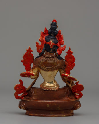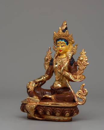 Shyama Tara, also known as Green Tara, is a beloved Buddhist deity of compassion, quick action, and protection. She responds promptly to prayers from those in need, guides followers to enlightenment, and removes impediments. This handcrafted statue, measuring 14.5cm tall and 11cm broad, is a stunning portrayal of her holy essence. It has a gold-plated finish over oxidized copper and beautiful acrylic color patterning.
