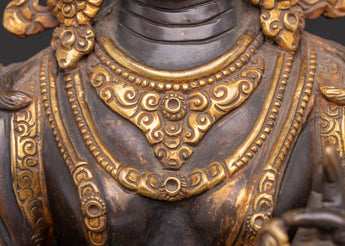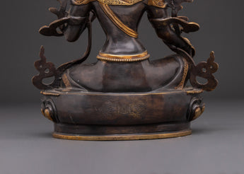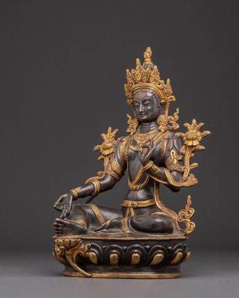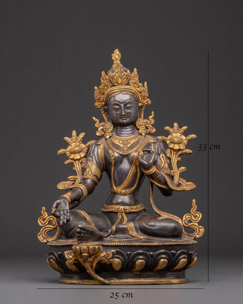 This Shyama Tara Figurine is a magnificent Tibetan Buddhist figurine representing compassion, protection, and swift action. This statue, 33 cm tall and weighing 3.45 kg, is precisely carved from oxidized copper with gold plating for a beautiful and sacred finish.