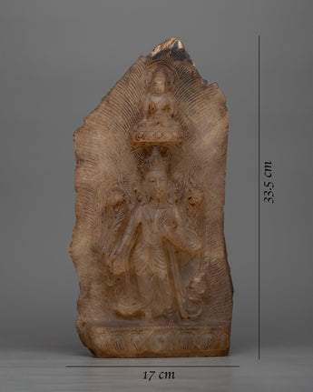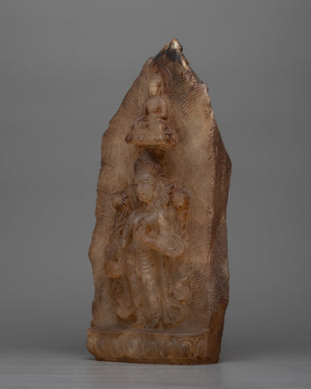 This statue is a remarkable feat of craftsmanship, weighing 4.59 kg and adding to its grandeur and stability. The natural clarity and brilliance of the crystal bring to life Green Tara's serene yet powerful energy, making the statue not only a visual delight but also a focal point for spiritual reflection and meditation.