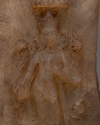Presenting our stunning Standing Crystal Green Tara Statue, a handcrafted masterpiece measuring 33.5cm in height. This meticulously carved statue of Green Tara, the revered figure of compassion and protection in Tibetan Buddhism, embodies the essence of the religion. Its rising stature commands attention in any setting.
