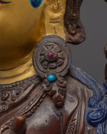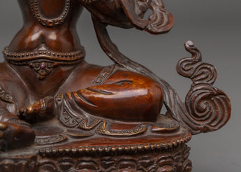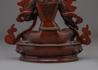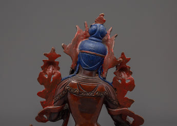 This Tibetan Buddhist Deity Green Tara Statue beautifully captures the revered Mother of Liberation, a vital figure in Tibetan Buddhism celebrated for her swift compassion, protective power, and enlightened actions. Standing 24 cm tall and 20 cm wide while weighing 1.97 kg, this statue presents Green Tara in an elegant seated pose with her right leg extended forward, symbolizing her readiness and eagerness to assist all sentient beings. Her right hand gestures charity, offering kindness and generosity, while her left hand forms the gesture of refuge, signifying safety and spiritual protection. Both hands are adorned with lotus blossoms, emblematic of purity, wisdom, and the blossoming of spiritual awakening. Crafted from oxidized copper, the statue emanates a subtle beauty and strength. An inspiring addition to any meditation space or altar, this statue encourages compassion, protection, and the pursuit of enlightenment, making it a meaningful offering for personal devotion or as a thoughtful gift for those on a spiritual path.