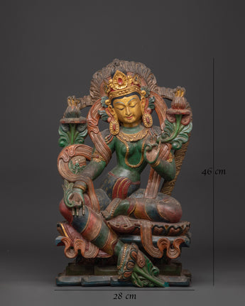 Accept the spiritual elegance of the Tibetan Green Tara Goddess Figurine, a stunning hand-carved wooden figure measuring 46cm tall and 28cm wide. This meticulously sculpted figurine embodies the essence of Green Tara, a famous Buddhist deity who represents compassion, protection, and prompt aid. This Tibetan Green Tara sculpture is ideal for meditation altars or sacred areas, acting as a potent spiritual tool to invoke serenity and healing energy.