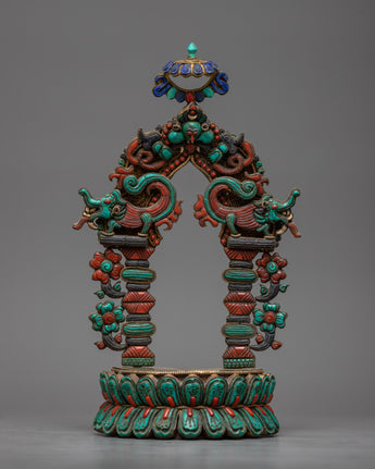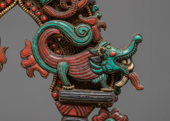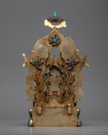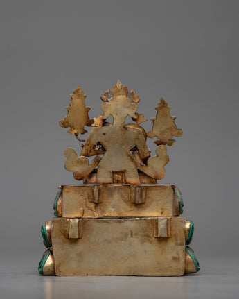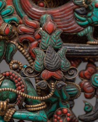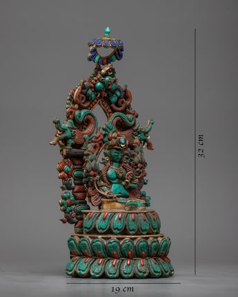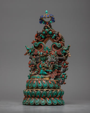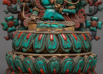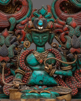 The Turquoise Green Tara Statue is a magnificent example of spiritual elegance and unmatched craftsmanship. This exquisite statue, which is crafted from a solid copper body and carefully plated in 24k gold, is a shining example of devotion. The delicate inlay of turquoise, coral, and lapis lazuli stones adds a vibrant spectrum of color and meaning to the piece, further enhancing the exquisite detailing.