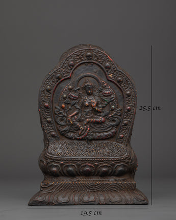 This stunning, wood-carved green Tara Statue is crafted from natural wood, adding an authentic and spiritual touch to your meditation or altar. This wooden sculpture, measuring 25.5 cm in height and 19.5 cm in width, depicts Green Tara, a revered Buddhist deity linked with compassion, protection, and healing. The delicate craftsmanship highlights Tara's tranquil and graceful nature, making this statue an ideal complement to any religious area or home decor.