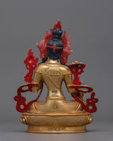 Green Tara Sculpture for Altar standing 8.5"/21.5cm tall and weighing 1.64 kg, this Green Tara Sculpture is a work of Nepalese artistry. With its copper body, 24K gold gilding, and gold and acrylic paintings, this statue exudes spiritual energy and divine beauty, making it the perfect focal point for your altar or meditation area.