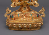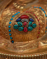The Peaceful Figurine of Chenresig measures 13.4 inches (34 cm) in height and 10.6 inches (27 cm) in base width. It is a work of art, crafted with 24K gold gilding that highlights the divine nature of Chenresig, the bodhisattva of compassion. The intricate details of the statue are enhanced with gold and acrylic paintings, which add a radiant, colorful dimension to the figure. The body of the statue is made from copper, providing a solid foundation for its graceful form. Additionally, the statue features hand-carved gemstones, which further elevate its beauty and spiritual significance.