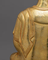 Amitabha is shown in a tranquil sitting stance, holding a begging bowl in his lap to symbolize renunciation and the simplicity of the enlightened life. His peaceful countenance represents the knowledge and compassion he bestows on individuals seeking rebirth in his Pure Land, Sukhavati. This statue, with its gold highlights and oxidized copper details, is a profound spiritual item suitable for devotional practice, meditation, or contemplation of Amitabha's teachings on unlimited light and boundless compassion.