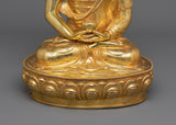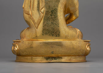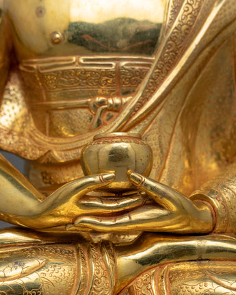 The Amitabha Buddha of Eternal Life sculpture depicts the Buddha of Infinite Light and Eternal Life, who embodies boundless compassion and the promise of rebirth in the Pure Land to those who call upon him. Standing 15.2"/38.5cm tall with a base width of 10.2"/26cm and weighing 5.72 kg, this sculpture is exquisitely made with 24K gold gilding, complemented with gold and acrylic paintings on a copper body, showing meticulous detailing and serene expressions.