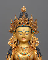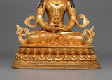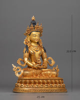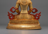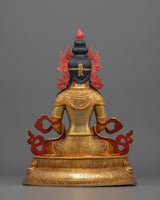 Amitayus is depicted in a calm seated position with his hands in the varada mudra (generosity gesture), representing his gift of endless life and compassionate blessings to all beings. His serene expression invites a profound connection to the Buddha's everlasting knowledge. The 24K Gold Gilded copper body highlights the fine details of his clothes and divine appearance, while gold and acrylic paint add to the statue's beauty and spiritual importance.