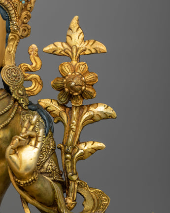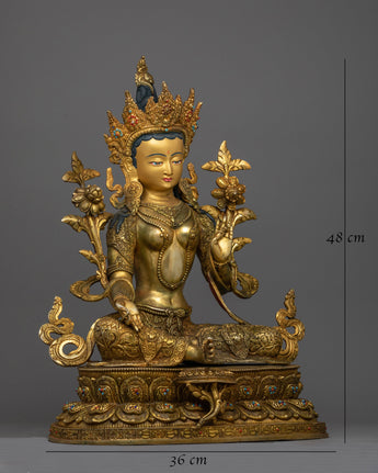 Discover the timeless elegance of our Antique Green Tara Figure, which was lovingly created by professional artisans. This statue stands 18.9 inches tall and has a 14.2 inch base. It is made of copper and is adorned with 24K gold gilding, gemstones, and complex acrylic paintings. The antique finish provides a sense of refinement and history to this beauty. Green Tara, venerated as the essence of compassion and quick action, is represented with peaceful grace and meticulous detail.
