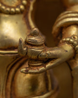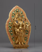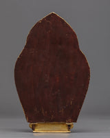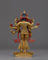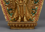 With the skillset and technique inherited over centuries, we have beautifully crafted the Arya Avalokiteshvara Sculpture in our studio. We used copper to sculpt the figurine and real 24K gold to gild it. We adored the deity with crowns and other bodily adornments for aesthetic purposes. This form of Avalokiteshvara is referred to as Amoghapasa. He has 8 arms. The primary right hand is in Abhaya mudra, while the rest of the arms hold different sacred ritual items. We have used materials of the highest quality to craft the statue. We assure you that this piece of art will last for many years. We used a hammer and small chisels to hand-carve the intricate design patterns. To do delicate carvings, artists must have decades of experience as he has to create intricate design patterns on a small surface area. He has to fulfill every minute detail on the statue based on the traditional iconography in Buddhist scriptures. The use of acrylic paintings gives the essence of a beautiful background.