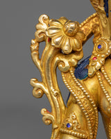 Presenting the Arya Tara Idol "Green Tara," one of the pantheons of Buddhist deities, is a celestial representation of proactive kindness and prompt aid. With a weight of 2.15 kg and an elegant height of 9.8 inches on a 6.6-inch base, this statue perfectly embodies Green Tara's vibrant energy and charitable spirit. With its intricate gold and acrylic paintings, intricate 24K gold plating, and copper body construction, this item embodies the spiritual purity and protective might of Arya Tara.