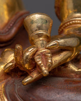 Skillfully crafted from copper with an oxidized finish, this statue exudes a timeless and dignified presence. The 24K gold gilding and gold and acrylic paintings intricately applied, highlight the exquisite detailing of Bajrasattva’s posture, attire, and symbolic attributes. The harmonious blend of oxidation and gold gilding creates a visually stunning piece that resonates with a sense of deep spiritual tranquility and wisdom.