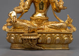 With one leg outstretched and ready, Green Tara is portrayed in her well-known stance, signifying her determination to act quickly to aid her believers. Her hands, in the gesture of granting boons and the mudra of compassion, further express her benevolence and her role as a guardian against physical and spiritual obstacles. The 24K gold gilding illuminates her divine form, casting a luminous aura that enriches any spiritual or contemplative space. The intricate gold and acrylic paintings bring depth and vitality to her compassionate expression and ornate attire, inviting admiration and reflection on the path to overcoming obstacles with wisdom and grace.