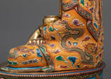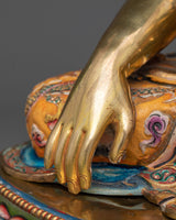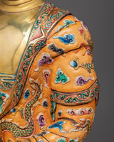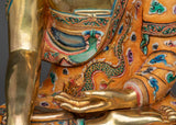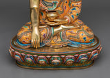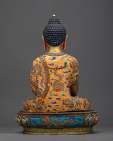 Presenting the Shakyamuni Buddha Statue, a magnificent portrayal of Siddhartha Gautama, the Buddha's originator. This statue, which stands serenely at a height of 18.1 inches on a base of 12.5 inches and weighs 8.32 kg, embodies the profound peace, wisdom, and compassionate insight of the Buddha. This sculpture, made of a copper body and embellished with intricate gold and acrylic paints and 24K gold gilding, represents the path toward enlightenment and inner serenity.