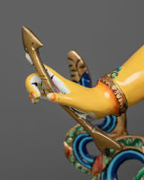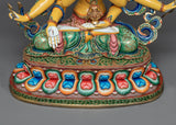 The figure is finely carved from copper and generously gilded in 24K gold. The gold and acrylic paintings accentuate Namgyalma's tranquil yet forceful look and her intricate iconographic characteristics, adding to the statue's holy atmosphere. The careful craftsmanship and vibrant color palette not only make this monument visually attractive, but also highlight its profound spiritual meaning.