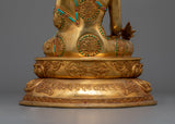With the Bhaiṣajyaguru Statue, which is made with unmatched devotion and creativity, enter the realm of divine healing and spiritual refreshment. This magnificent statue invites you on a voyage of complete well-being and inner transformation with its healing radiance and divine elegance. Exhibiting painstaking artistry, it boasts elaborate 24K gold gilding, radiant acrylic and gold paintings, and hand-carved gemstones that perfectly encapsulate the restorative power of Bhaiṣajyaguru. The statue exudes the Medicine Buddha's healing energy because every detail reflects the talent and commitment of skilled craftspeople. Whether it is put in your home, business, or sacred location, behold its calm visage and loving presence, bringing tranquility and inner peace and acting as a potent reminder of the healing potential inside us all.