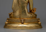 The Bhaisajya Guru Buddha Sculpture is an excellent portrayal of the Medicine Buddha, who is revered in the Buddhist tradition for his incredible healing powers and represents the healing part of all Buddhas. Standing 13.3 inches tall and weighing 3.91 kg, this statue is meticulously made from a copper body, embellished with 24K gold plating, and accented with intricate gold and acrylic paintwork. It is a potent emblem of health, healing, and the end of suffering.