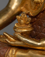 This sculpture is made of oxidized copper and gilded with 24K gold, exhibiting a strong feeling of devotion and holiness. The statue's exquisite gold finish not only adds to its visual attractiveness but also represents Bhaisajyaguru's celestial nature and healing abilities. The intricate gold and acrylic paintings enhance the statue by highlighting Bhaisajyaguru's peaceful demeanor and the symbolic instruments he holds.