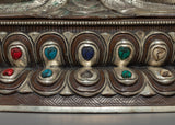 The dazzling silver plating brings out the exquisite features of Aparamita's tranquil countenance and symbolic gestures, which contrast nicely with the deep, rich tones of the oxidized copper. The addition of hand-carved gemstones adds an element of earthly beauty to the divine figure, symbolizing the illuminated path of enlightenment that Aparamita guides followers along. This statue not only serves as a focal point for devotion but also as an inspiration for those on the spiritual journey toward ultimate liberation.
