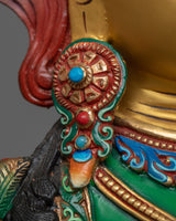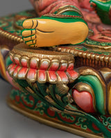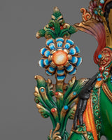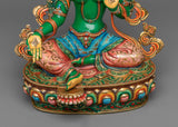 The statue is precisely constructed from a copper body, which was chosen for its durability and historical significance in religious art. It is wonderfully embellished with a triple layer of 24K gold gilding, giving it a magnificent brilliance that reflects Green Tara's caring nature. The detailed gold and acrylic paintings enhance the statue, highlighting Green Tara’s benevolent expression and the intricate folds of her robes.