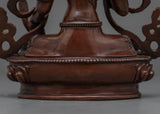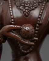 This magnificent statue of the Bodhisattva Ksitigarbha was created by a team of sculptors from Kathmandu, Nepal, using traditional Himalayan art in our studio. He is depicted sitting on a lotus seat and wearing exquisitely designed jewelry. He has a pearl in his right hand that has unfathomable magical qualities. The Varada mudra, which means "gift offering," is also seen on his left hand. His headpiece, which resembles lotus petals, looks appealing in his hair with more gems on top. We molded the figurine using oxidized copper. All the intricate attributes of the deity are hand-carved.