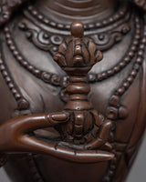 We have meticulously hand-carved this classic oxidized copper statue of Bodhisattva Vajrasattva in our studio. In the statue, the Bodhisattva gracefully sits on a moon disc flower seat in the statue, exuding sublimity, holding the vajra in his hand. He can be seen seated in a lotus posture. His headpiece, body ornaments, and the lotus seat are full of intricately detailed carvings with hammers and chisels by our traditionally skilled Vajrayan Artists.