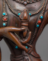 Delicately handcrafted in our workshop, the Bodhisattva Vajrasattva statue is intricately designed with unique Nepali motifs. The Bodhisattva can be observed in his typical calm and tranquil demeanor, seated on a moon disc lotus seat and in the lotus position. He carries a vajra, a ritual item that represents the impermanence and constancy of reality, in his right hand and a bell, which stands for emptiness and the sound of wisdom, in his left hand. The statue is carved out of oxidized copper, adding an element of antiquity. The partial gold gilding and acrylic painting highlight his peaceful facial expressions, while the additional gemstones to the statue adorn the deity.